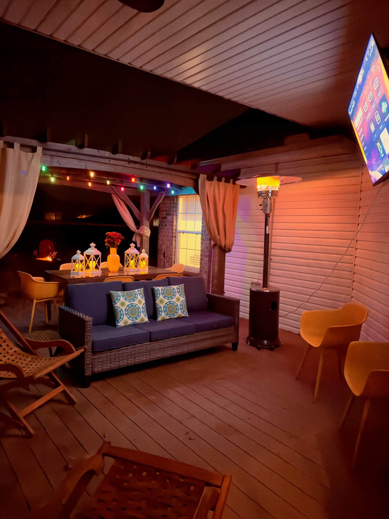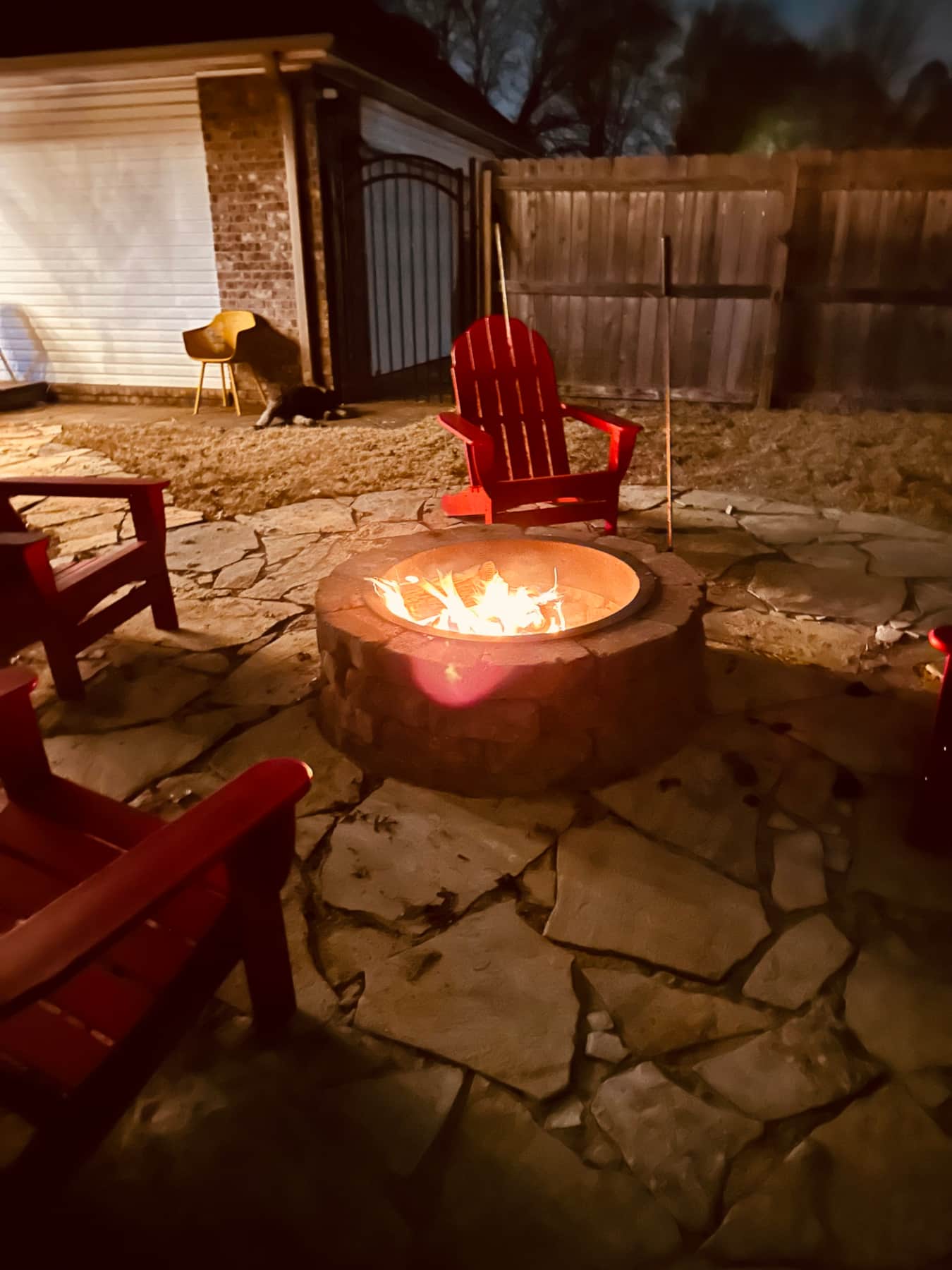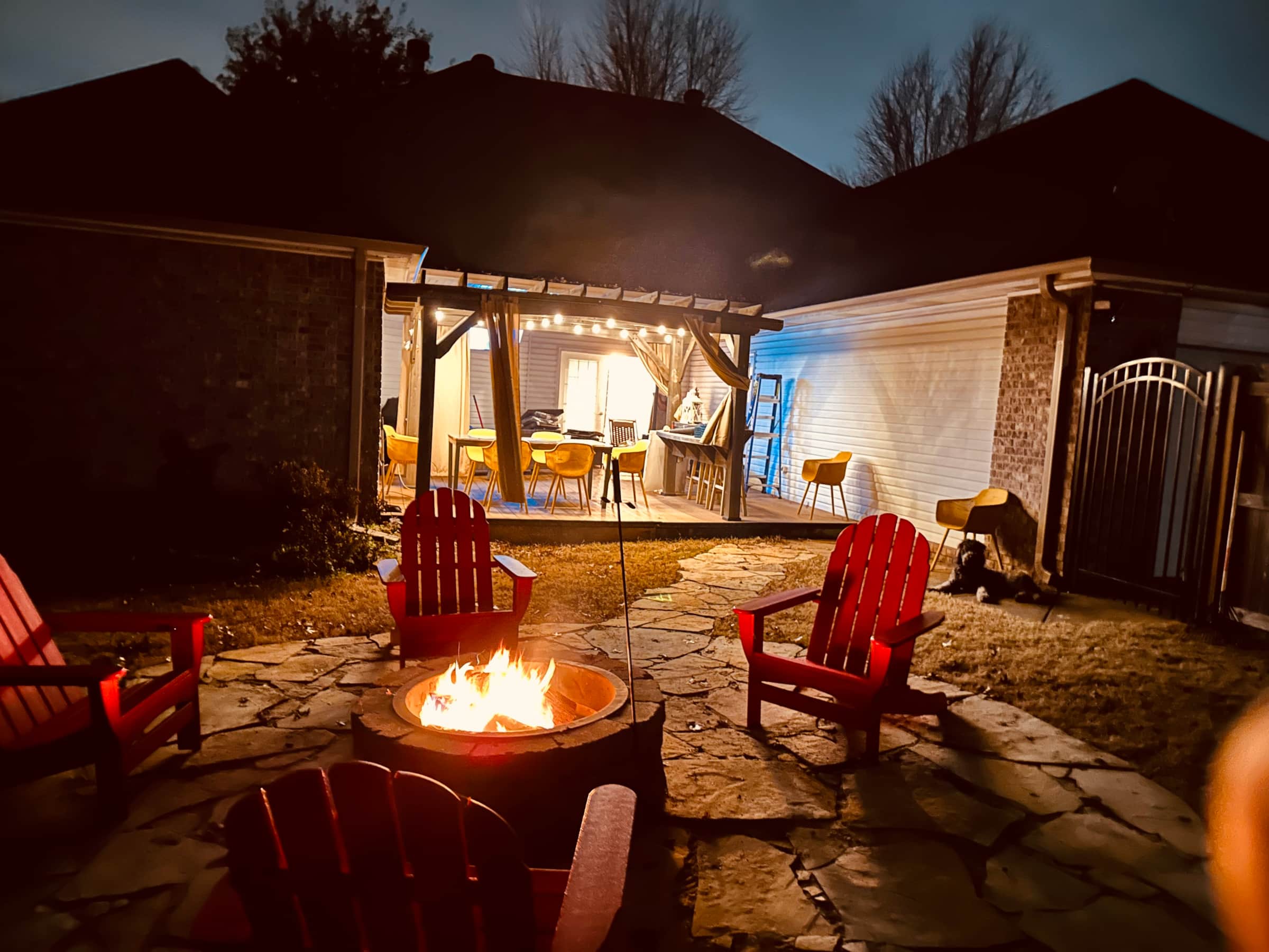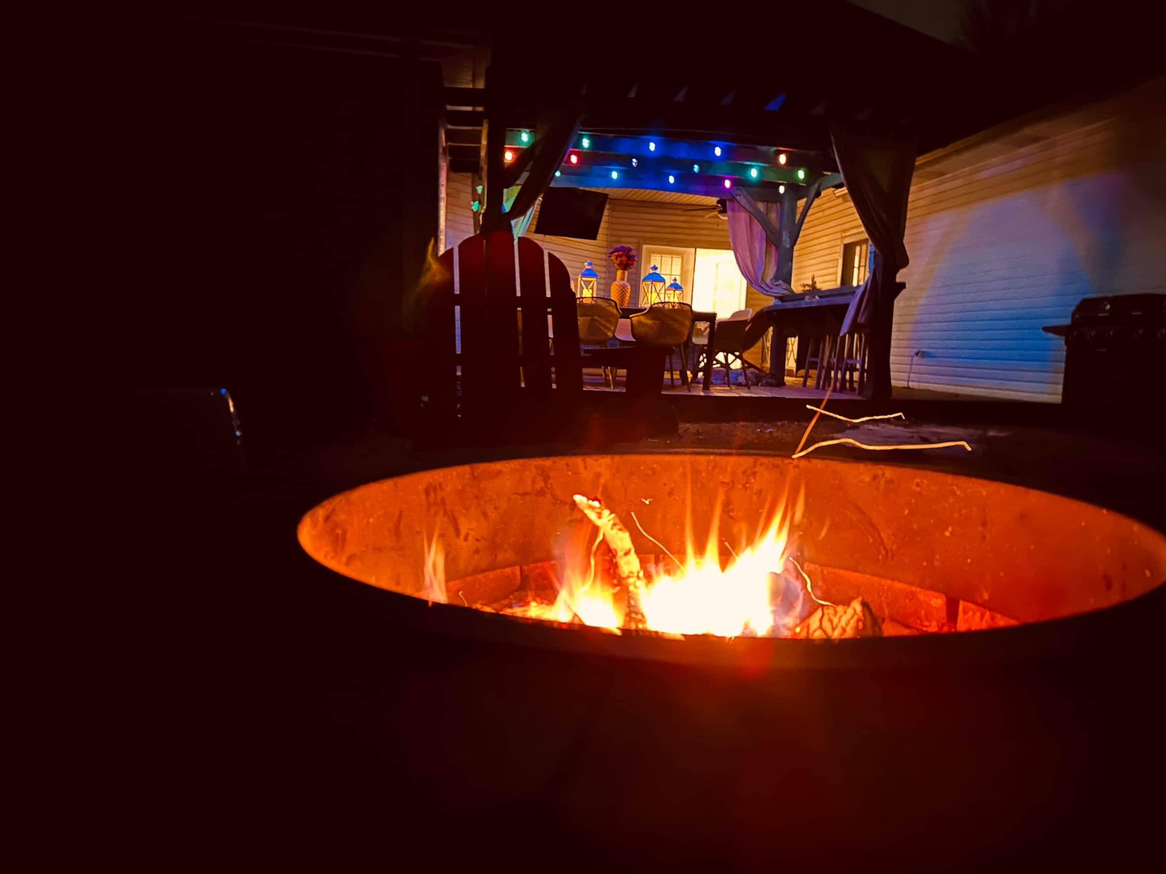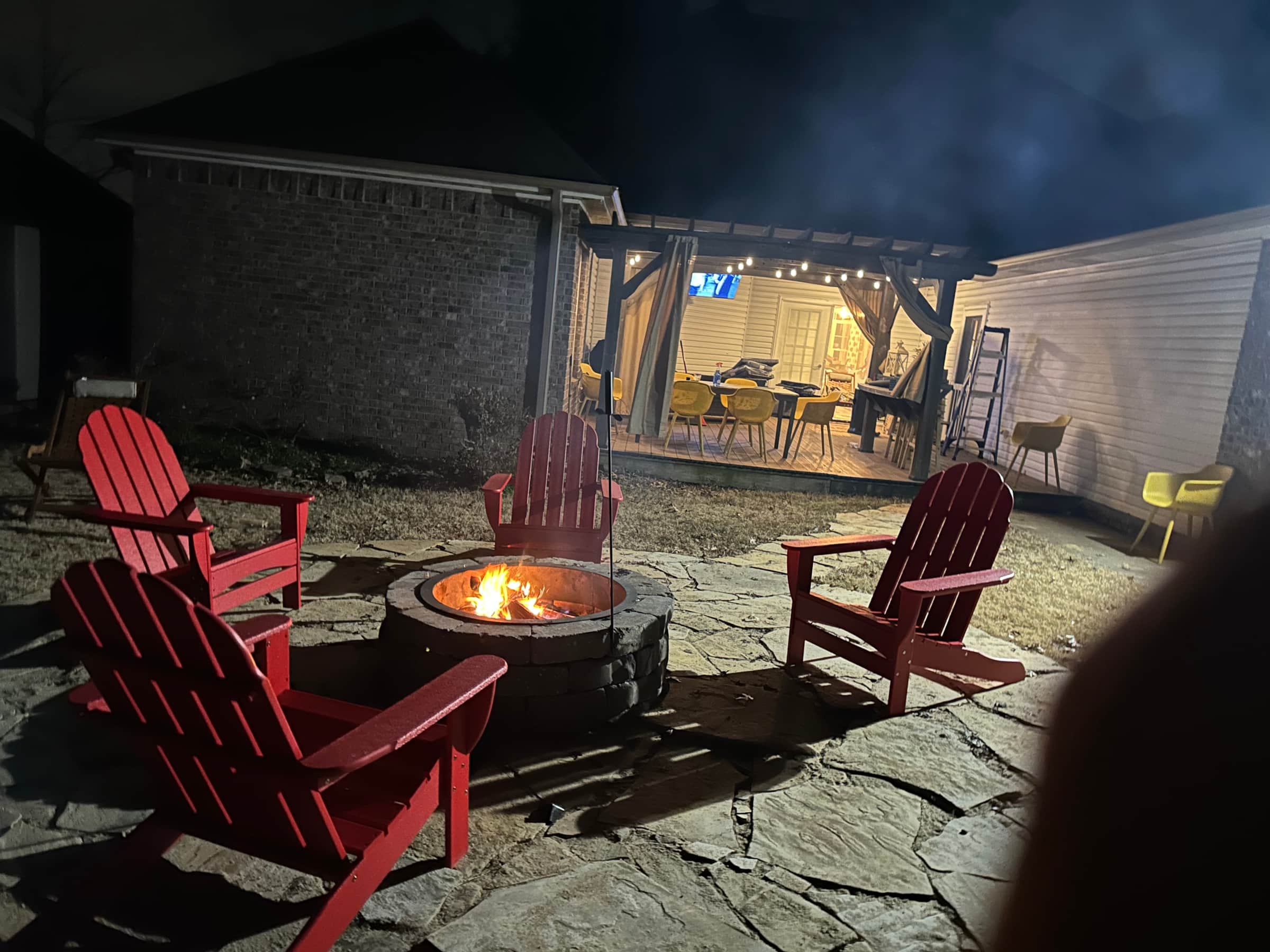Home has large fenced in back with a huge deck and dining area. Patio furniture, a bar and dining for 8 plus a giant TV. Also there is a fire pit with area seating and free firewood.