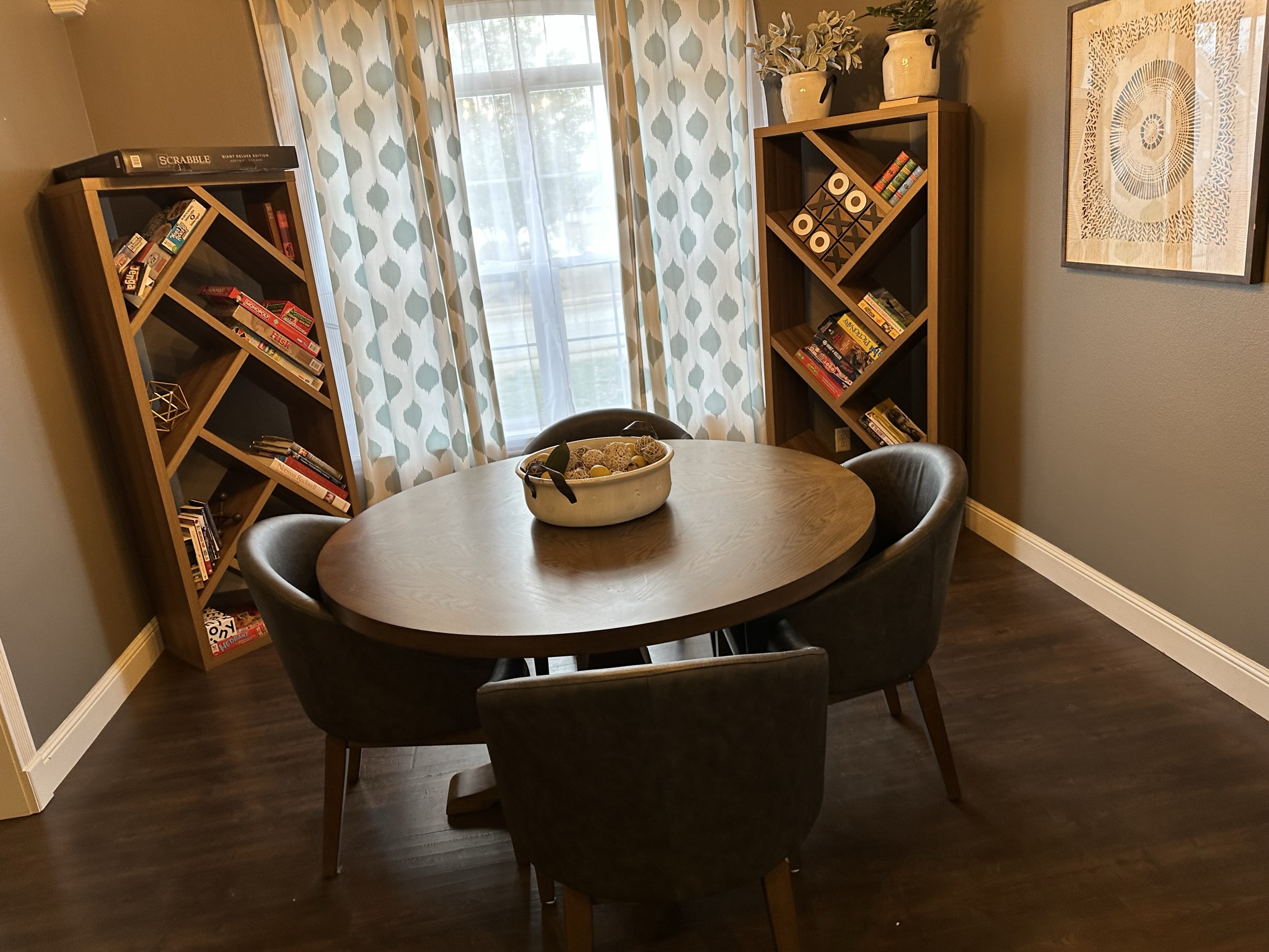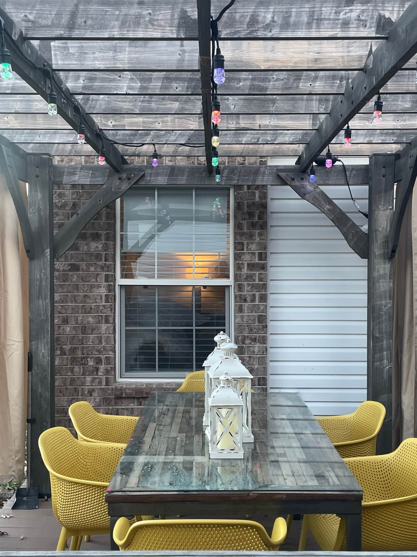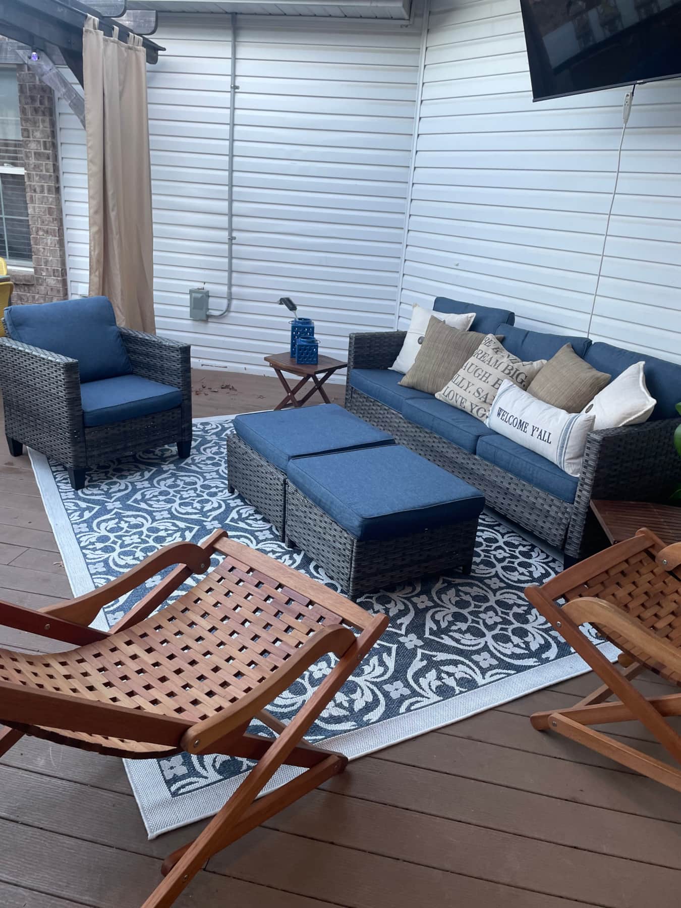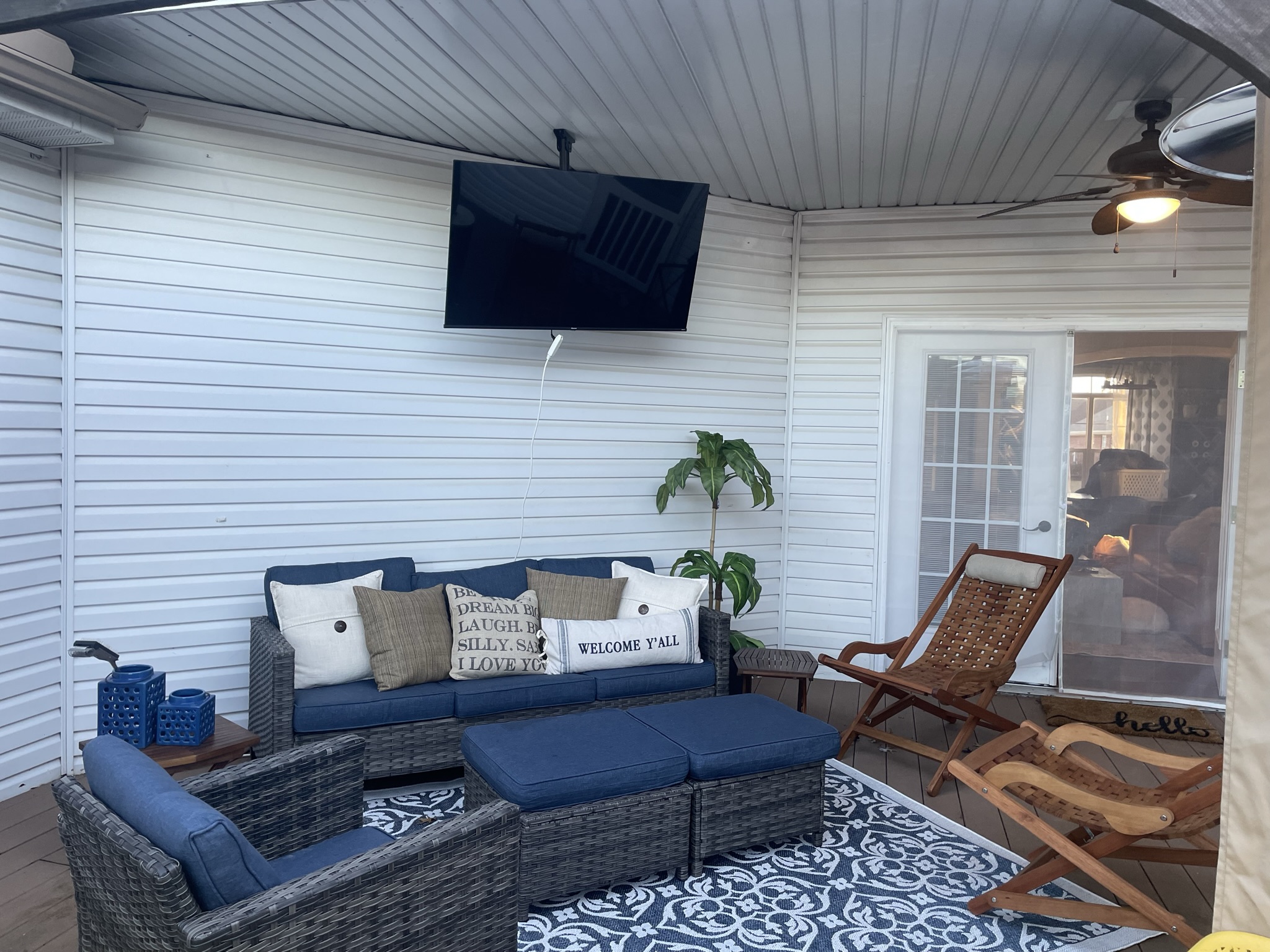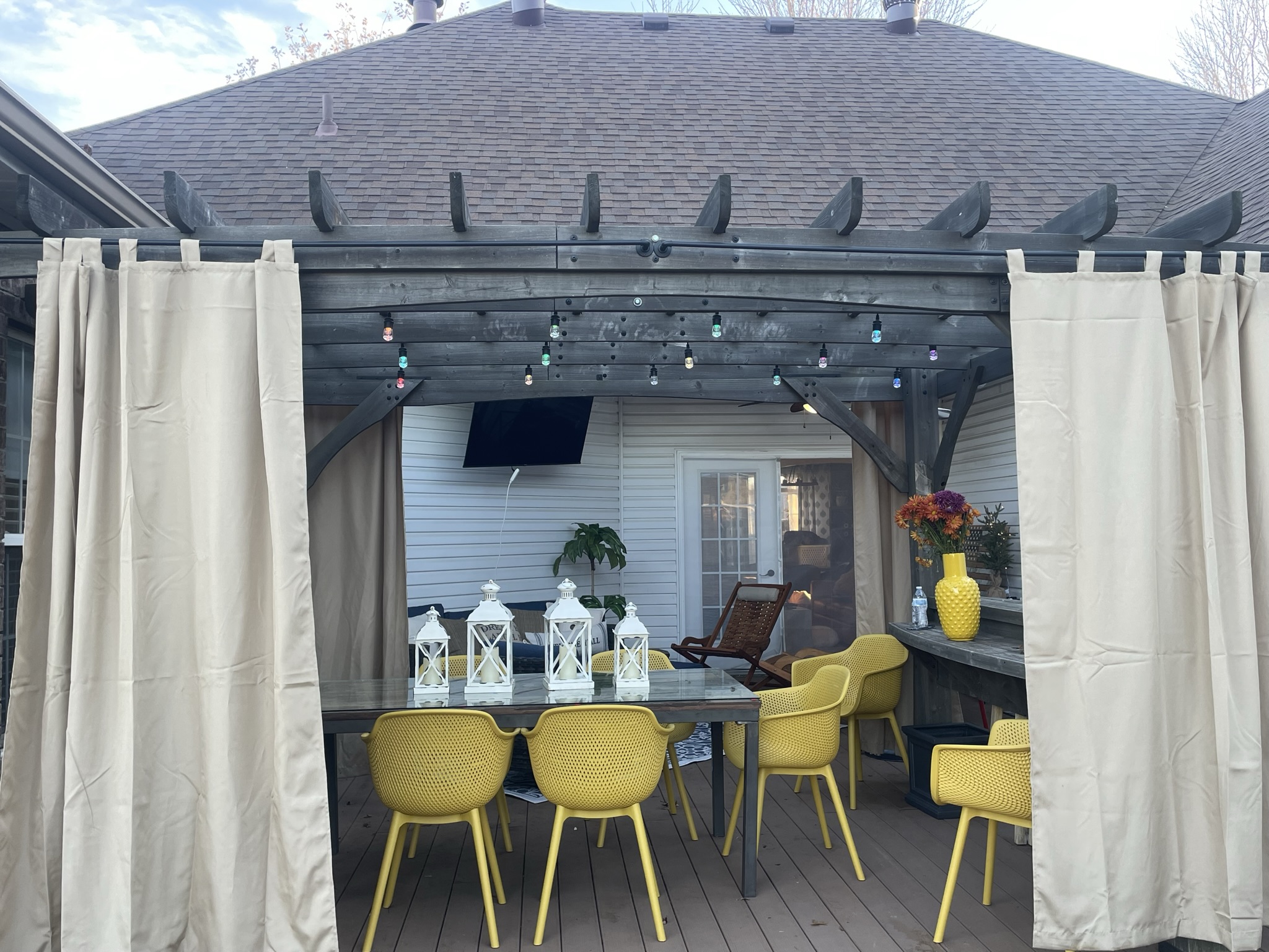 Home has large fenced in back with a huge deck and dining area. Patio furniture, a bar and dining for 8 plus a giant TV. Also there is a fire pit with area seating and free firewood.